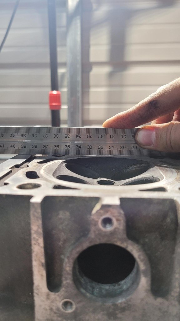 Easiest way to check if the surface is flat is with a straight edge and a light source behind it. On a flat surface like the 2nd picture above there is no light shining through. This head does not seem to be warped as the edges are all straight but there are a tone of flat spots namely around the part where the gasket blew. Between the water jackets, cylinders, and oil passages. The only way to fix this is to resurface it at a machine shop. A local shop quoted $175 to face and clean this head. Now we wait for its return. I have a few theories on how this came to be. Someone could have sanded it with power tools previously which could have led to low spots. It could also have not been cooled properly or fed too quickly through a surfacing machine. This leads the material to heat up and expand. When the bit comes through it takes off the expanded material. It then cools leaving a low spot similar to what can be seen here.