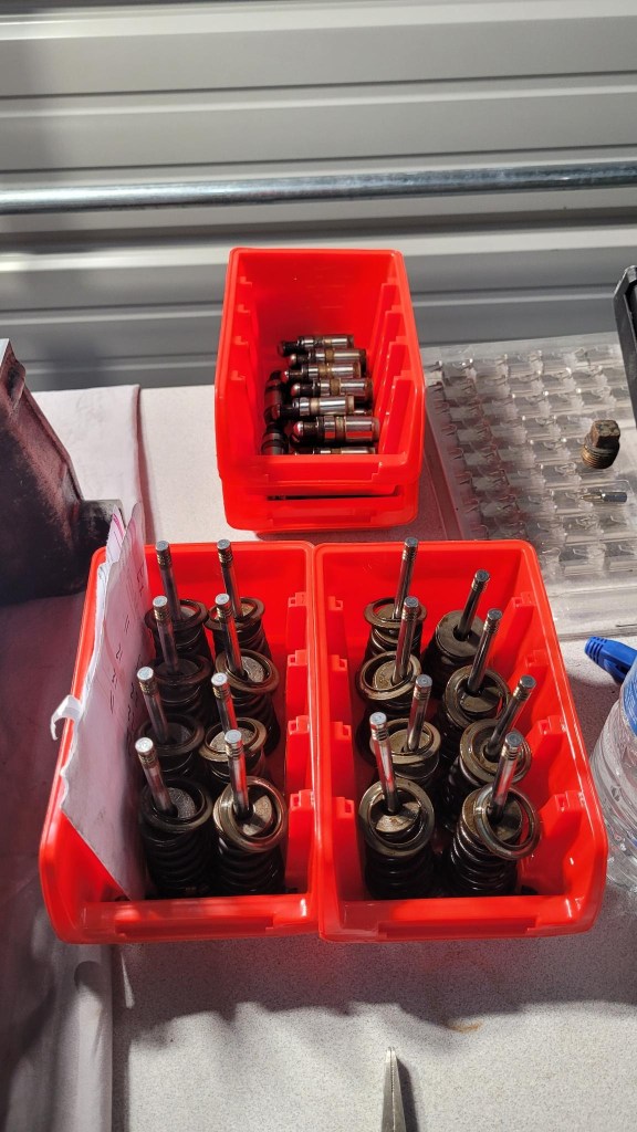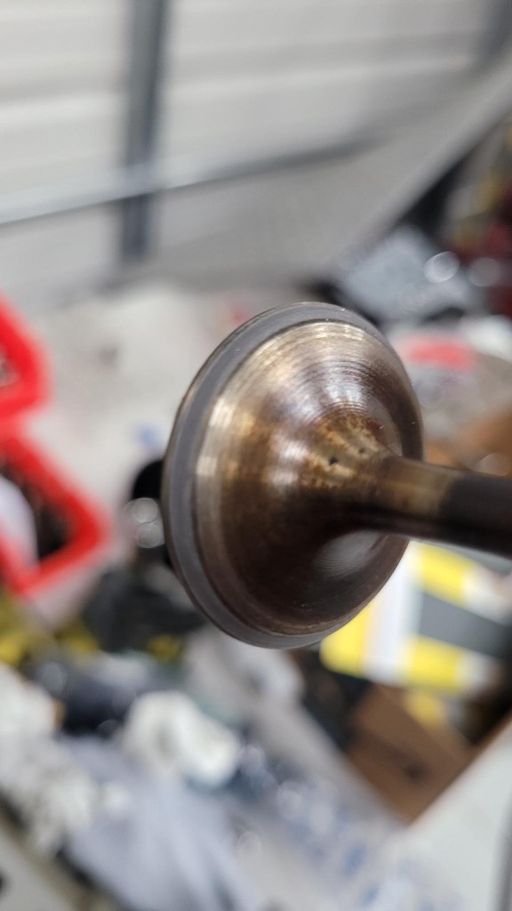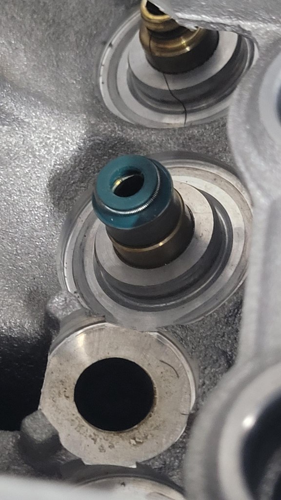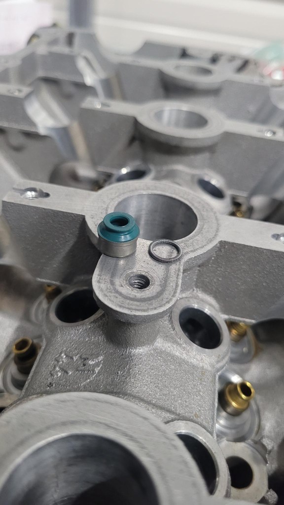 The head came back with a nice clean surface finish. It was now ready for reassembly. The valves got “lapped” with some off the shelf lapping compound and tool. Essentially you quickly spin the valve back and forth with what is liquid sandpaper in between. It takes off a tiny bit of material between the valve and seat making the fit perfect enough to make an air tight fit. Looking at the picture above, the gray ring shows the contact area in-between the head and the valve. After this is done that valve has to be installed in the exact seat it was lapped in or it will not seal correctly. After this the little valve seals got installed, as well as the valve springs and keepers. All the studs placed back in, and cams placed back in.